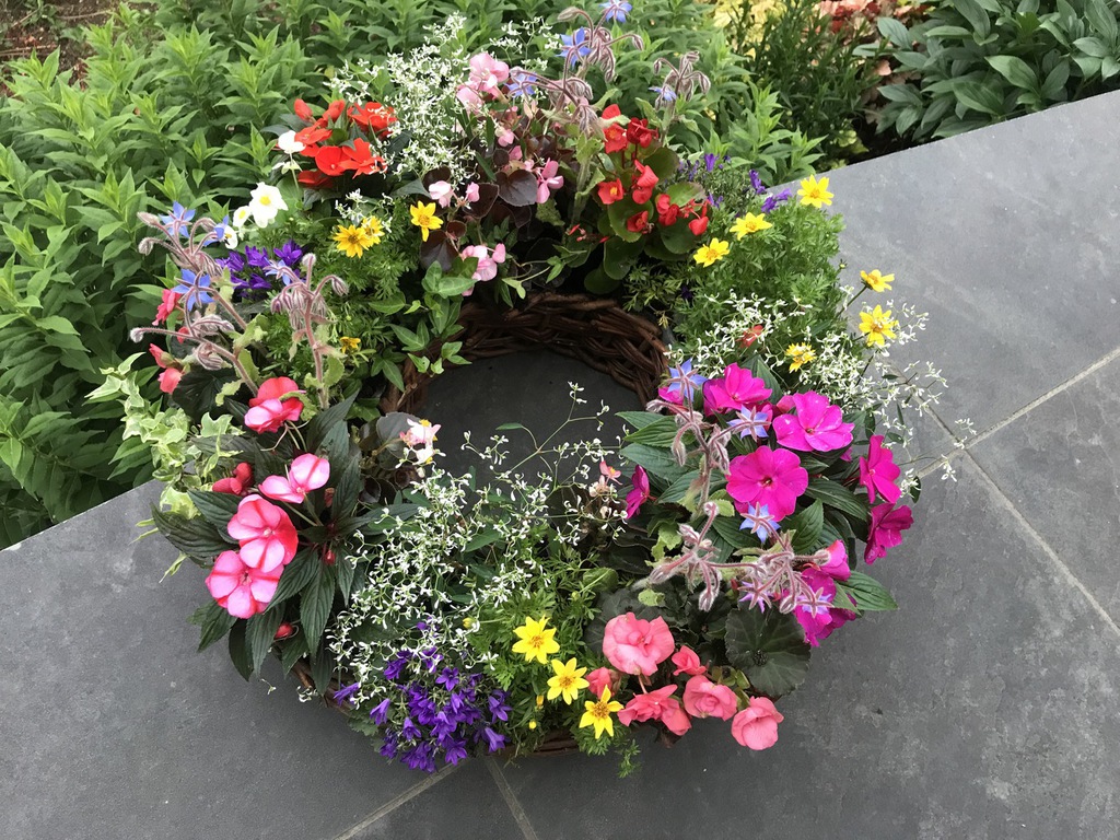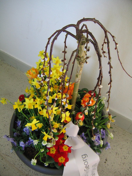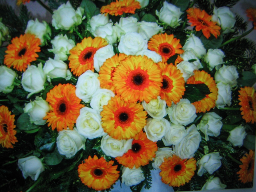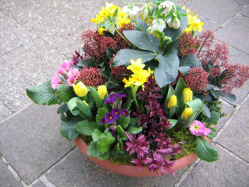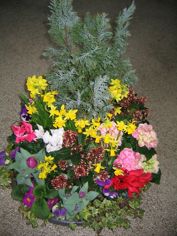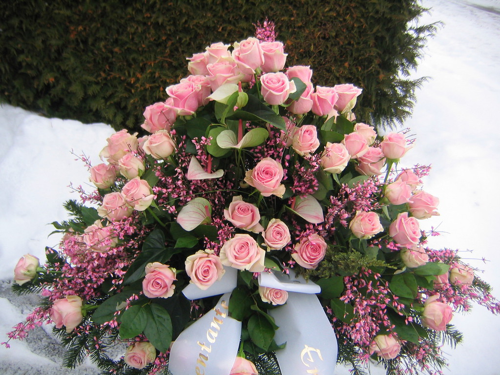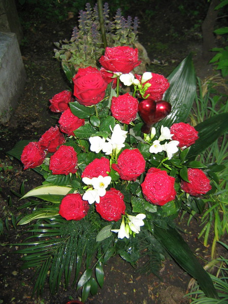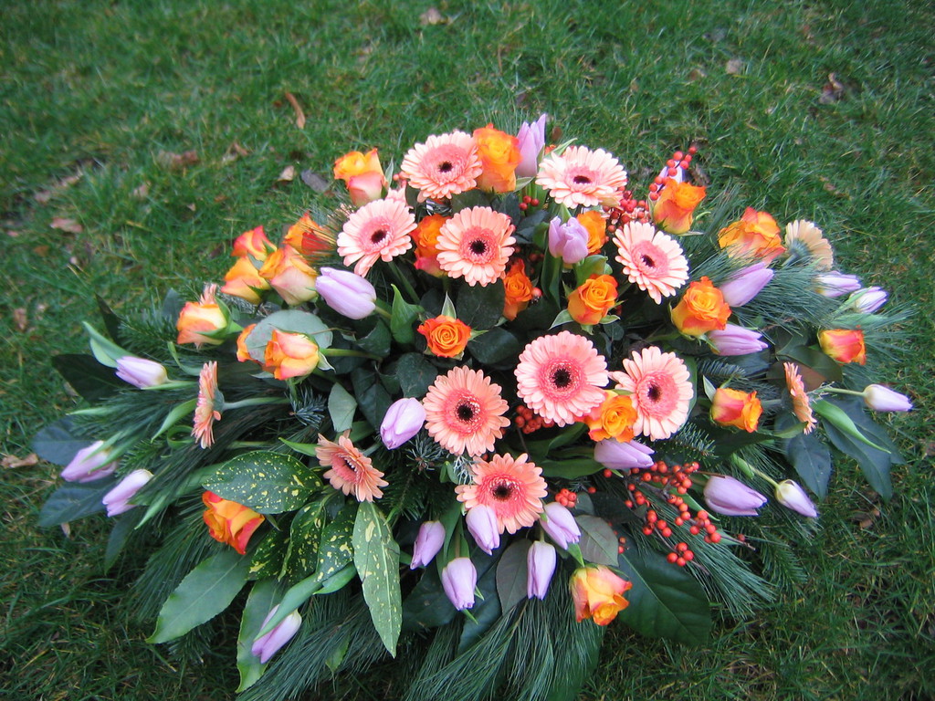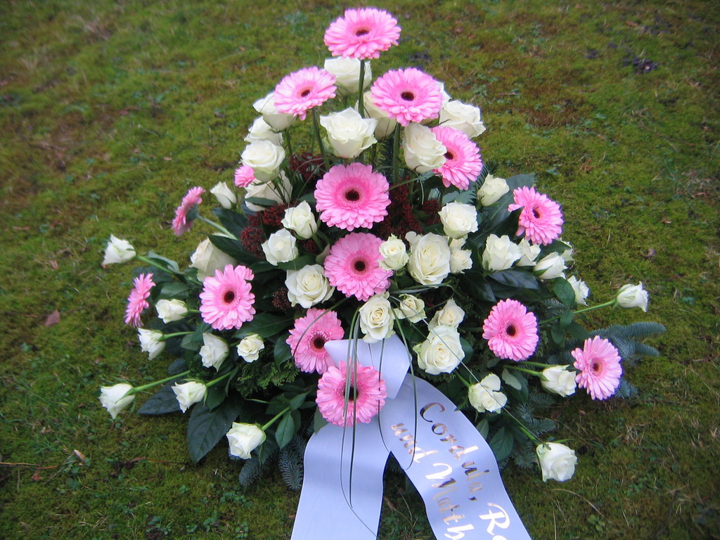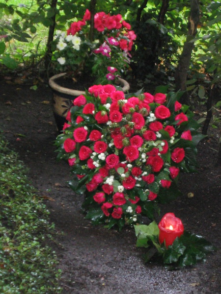 Es können auch Bouquets, Herzen, Kreuze, bepflanzte Schalen oder Trauergestecke verwendet werden.