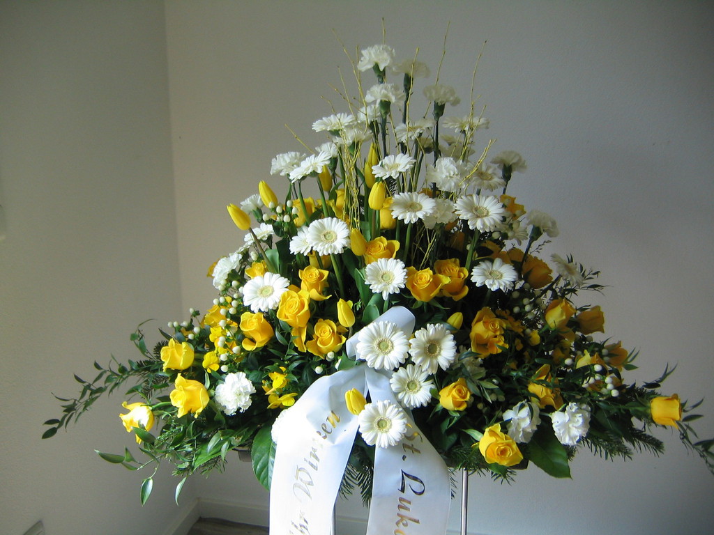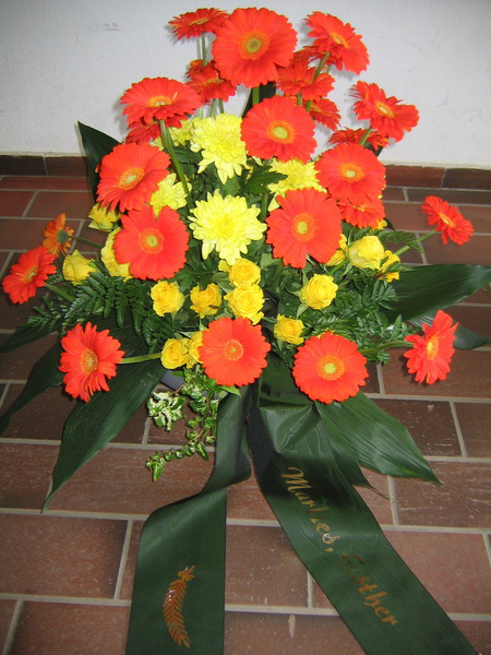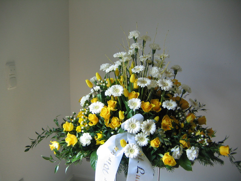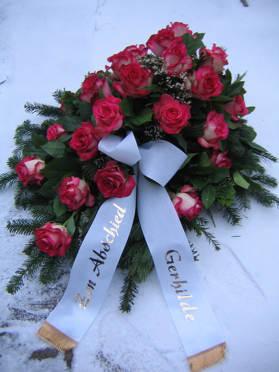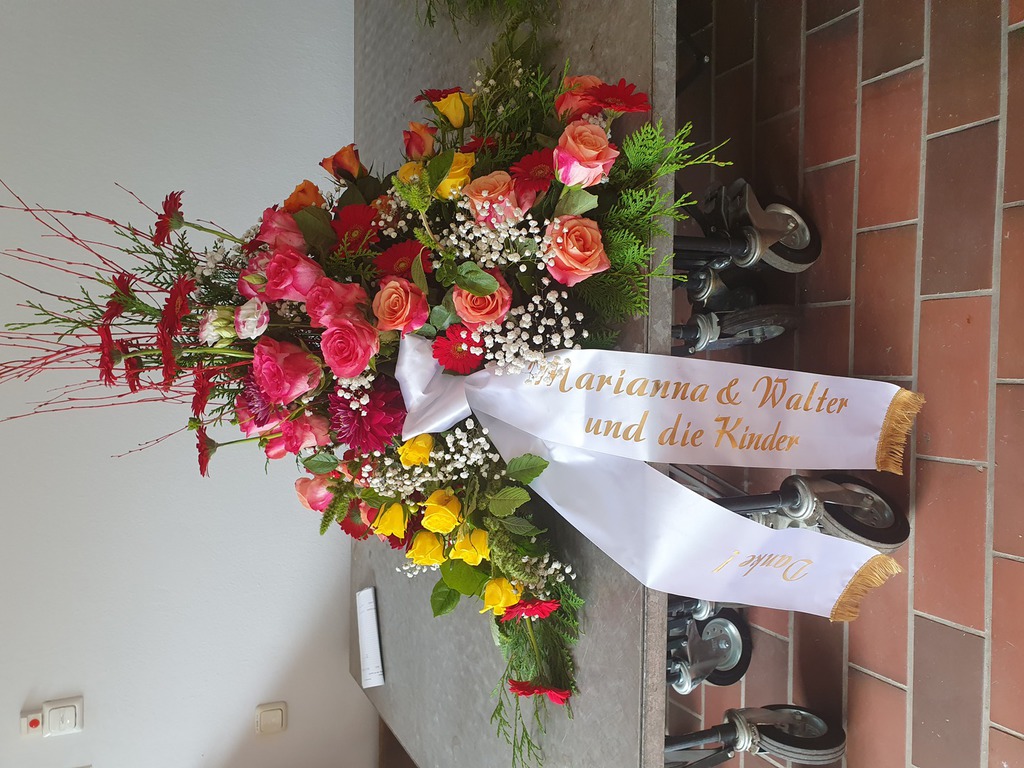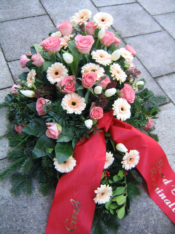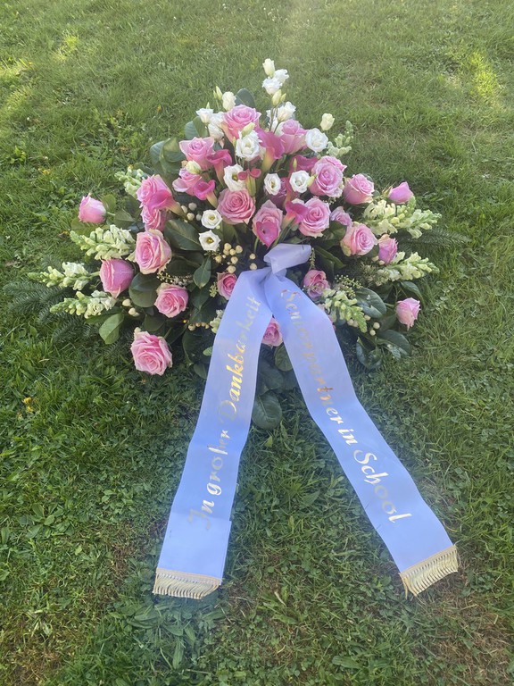 Um dem eine persönliche Note zu verleihen, empfehle ich eine Trauerschleife dazu mit individuellem passendem Text, die Verbundenheit und Wertschätzung mit dem Verstorbenen Ausdruck verleiht.